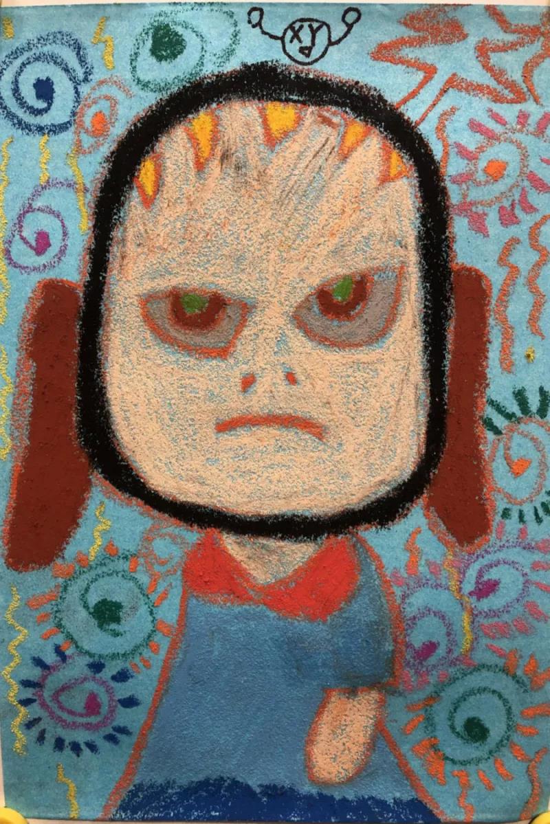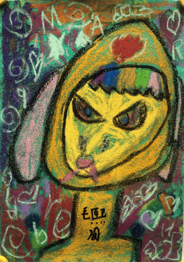 毛熙月(女)這幅畫借鑒了奈良美智的名作《寂寞的小狗》。畫中“似狗非狗”的形象給人一種另類的感受,小朋友使用了大量橘黃色描繪主體形象,加大直觀的沖擊力。這種看似格格不入的色調(diào)與裝扮,加上背景各種顏色的拼接和符號的添加,有種特立獨(dú)行的意味。