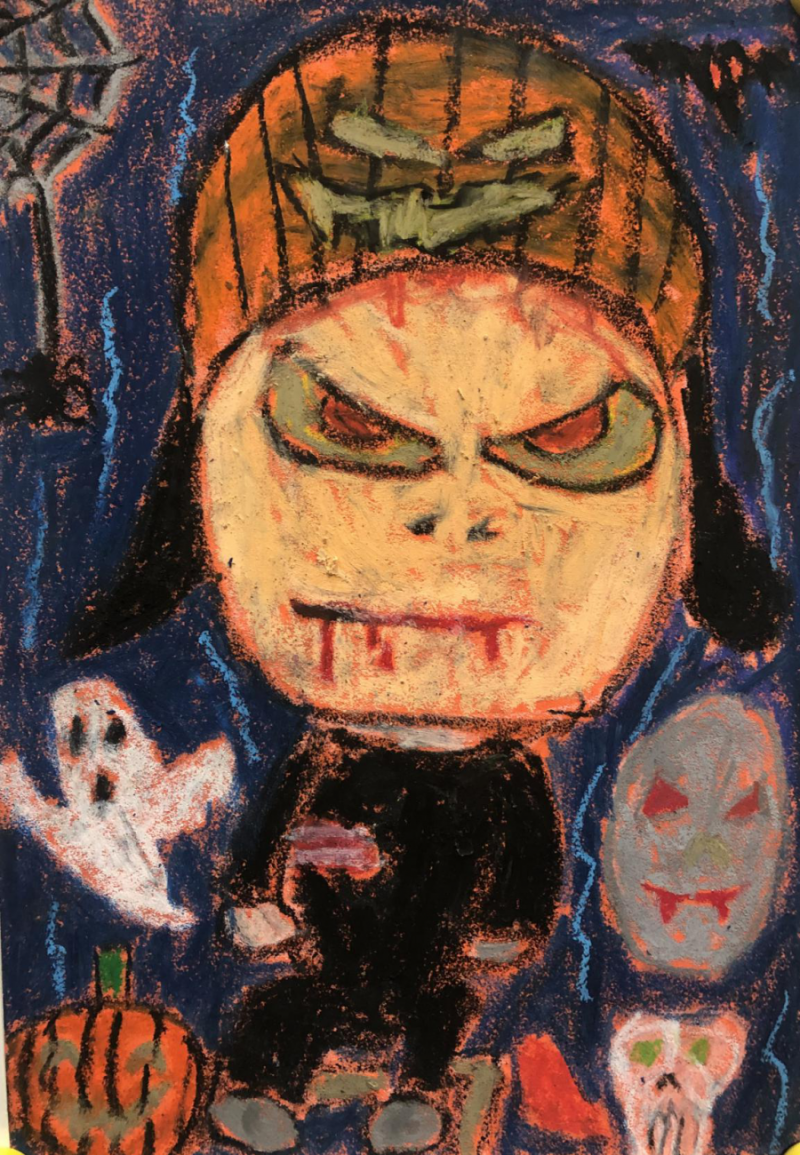 丘翊辰(男)小朋友這幅畫描繪了充滿搞怪的萬圣節(jié),我仿佛看到鄰居家的熊孩子跑來敲門向我要糖果的樣子。小畫家顏色搭配得非常好,畫面用深藍(lán)色來表現(xiàn)萬圣節(jié)的背景。幽靈的白色,南瓜的橘黃,鬼怪的灰色,蝙蝠、蜘蛛和衣服的黑色,全部混合搭配在一起又不會(huì)顯得色調(diào)沉重,萬圣節(jié)的各種元素搭配使用非常到位。一些零碎的點(diǎn)線面的裝飾,與背景色融合恰當(dāng)。大臉娃娃的可怕表情和眼神,讓我有種不寒而栗的感覺,像是在說:“不給糖就搗蛋!”